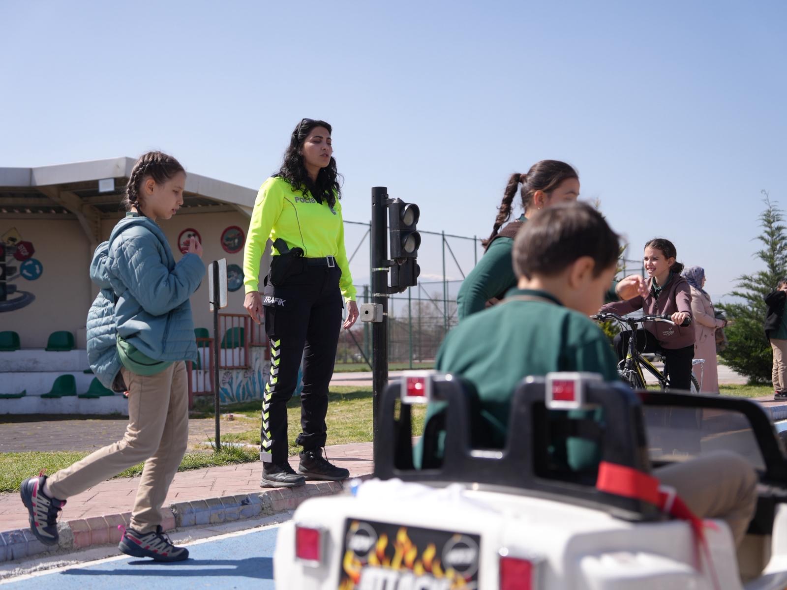 Trafik kurallarına uygun durma, duraklama ve park etme yöntemleri, uyulması gereken manevra kuralları, güvenli takip mesafesi, emniyet kemerinin önemi, trafik levhalarının ve yol işaretlerinin anlamları, trafik ışıklarında sürücü ve yaya olarak davranış metotları hakkında bilgilerin de sunulduğu eğitimlerde oluşturulan trafik parkurunda eğlenceli vakit geçiren 27 öğrenci öğrenirken bilinçlendi.